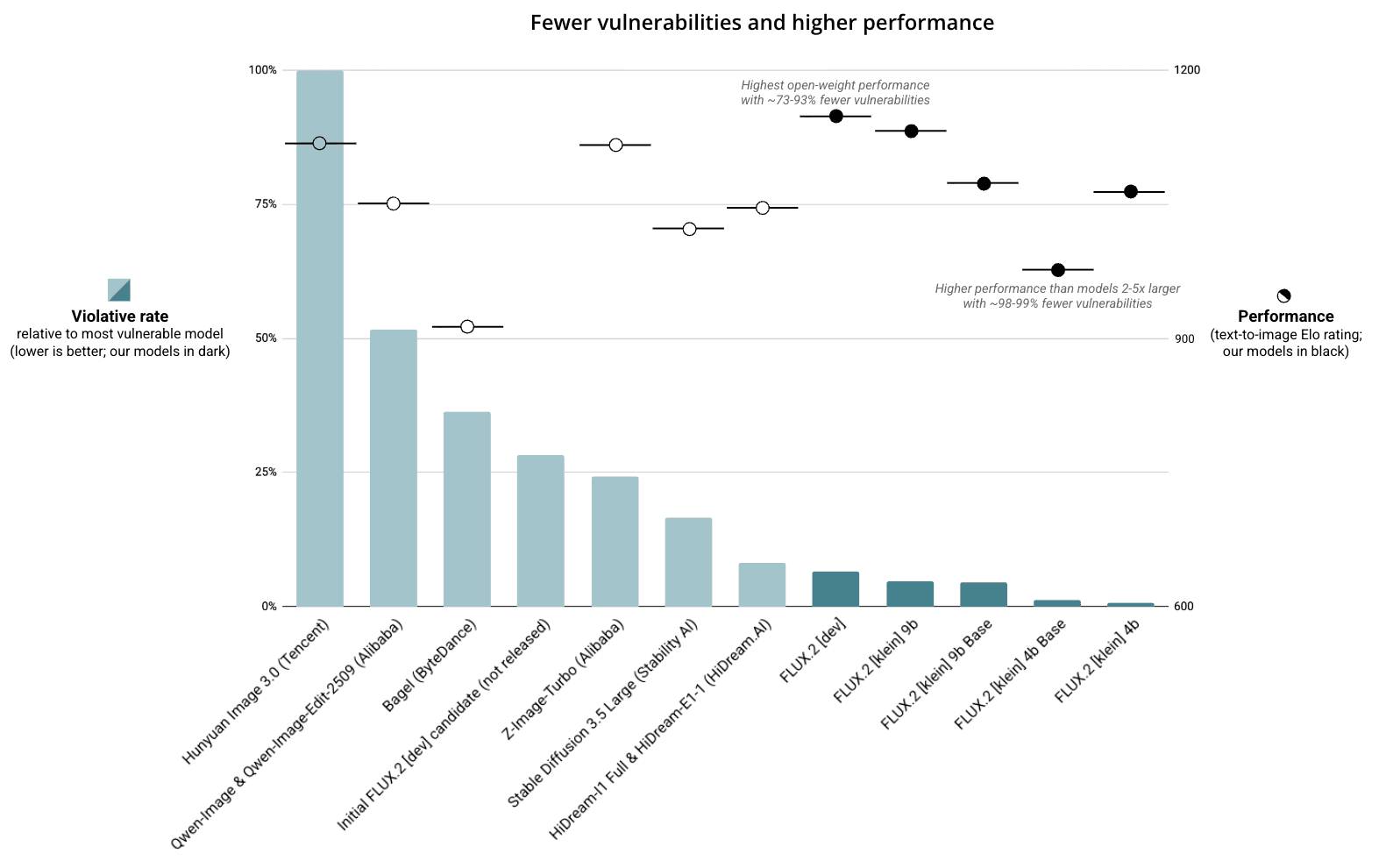 Above. Violative rates across popular open-weight models compared to the most vulnerable model evaluated (Hunyuan Image 3.0). Released Black Forest Labs models in dark green. n≈3,800 prompts, covering both T2I and I2I, NCII and CSAM attacks. Outputs were classified by human labelers. Models or model families capable of T2I and I2I were evaluated for both types of attack, else they were evaluated on a single modality only. Relative performance indicated by text-to-image Elo ratings (a measure of general performance; February 2026).